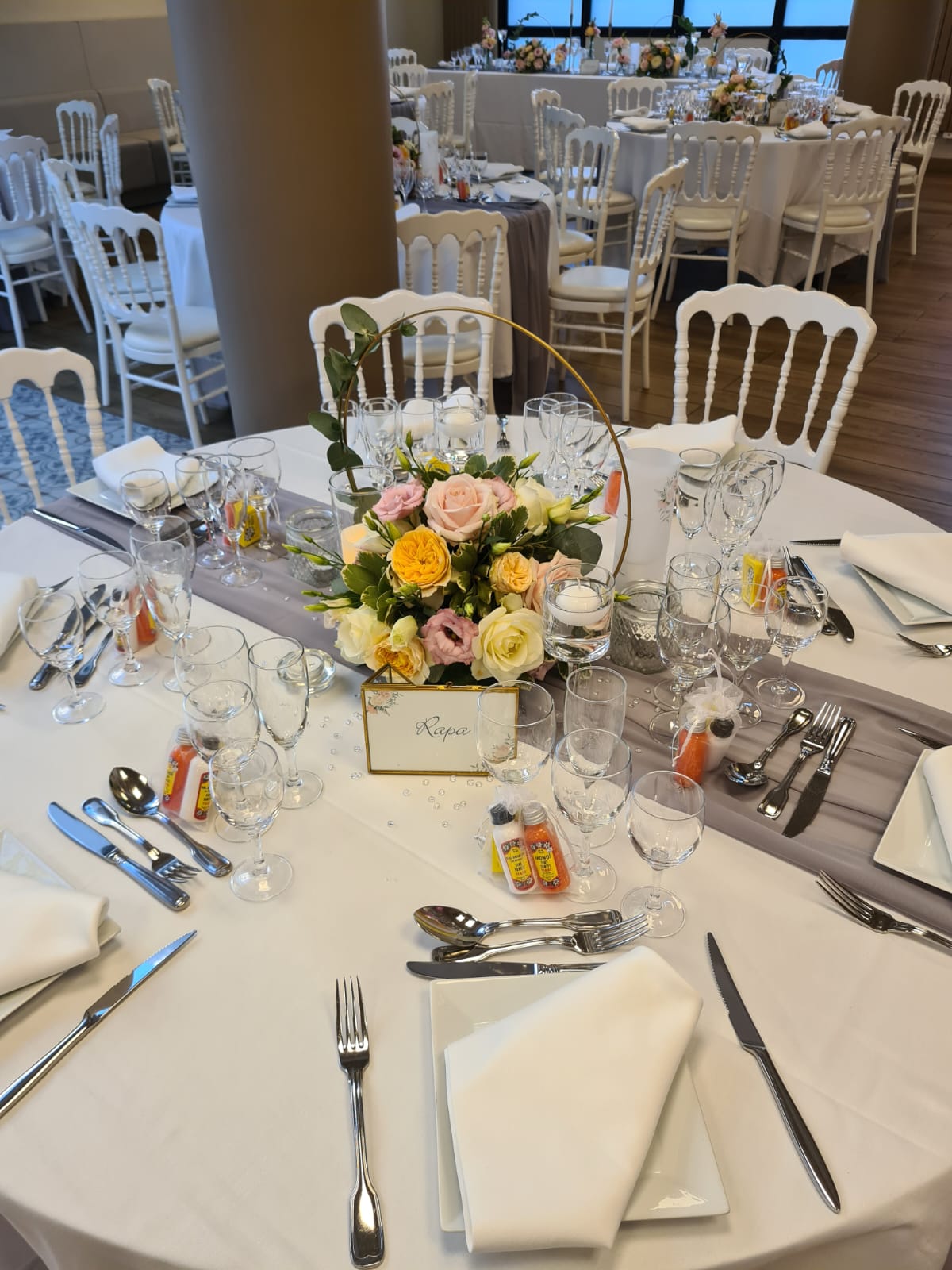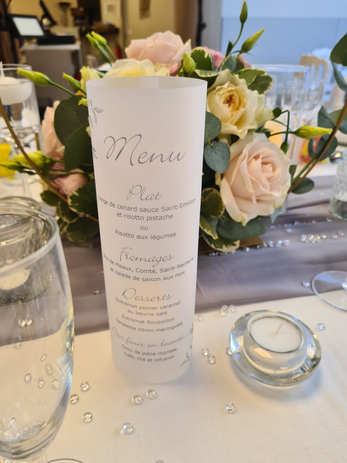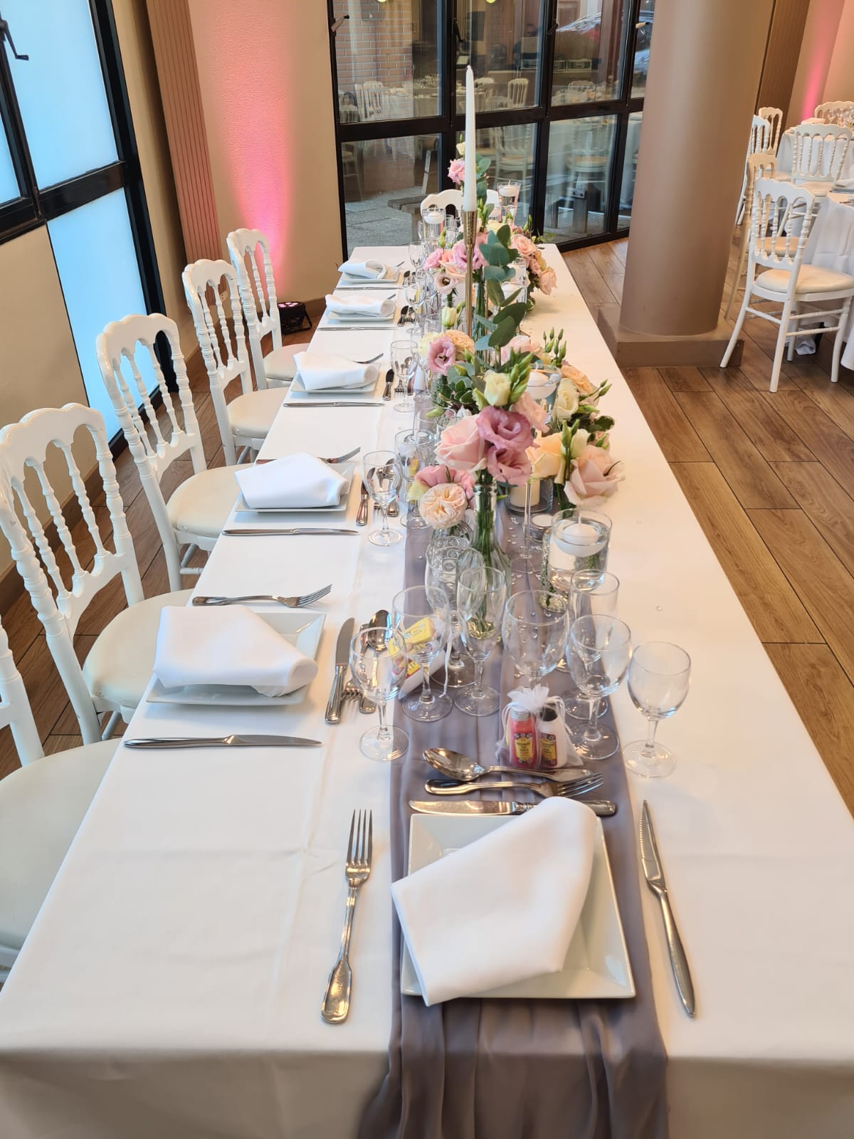 Élise et Mickaël ont choisi une thématique florale aux tons pastel, avec des roses délicatement arrangées et des compositions mêlant verdure et légèreté. Les tables, recouvertes de nappes blanches immaculées et ornées de chemins de table gris, étaient agrémentées de chandeliers et de petites perles décoratives, ajoutant une touche d’élégance.
